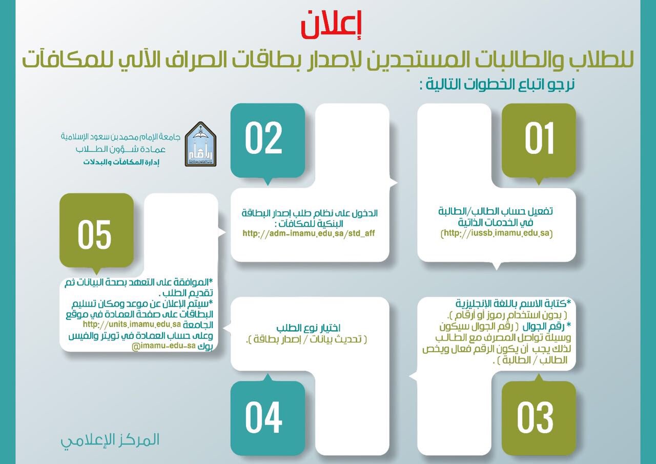 عمادة شؤون الطلاب On Twitter ضوابط إصدار بطاقة المكافآت البنكية للطلاب والطالبات Https T Co Kyhaxfsnwj جامعة الامام مكافآت Https T Co Tbgic6gpig